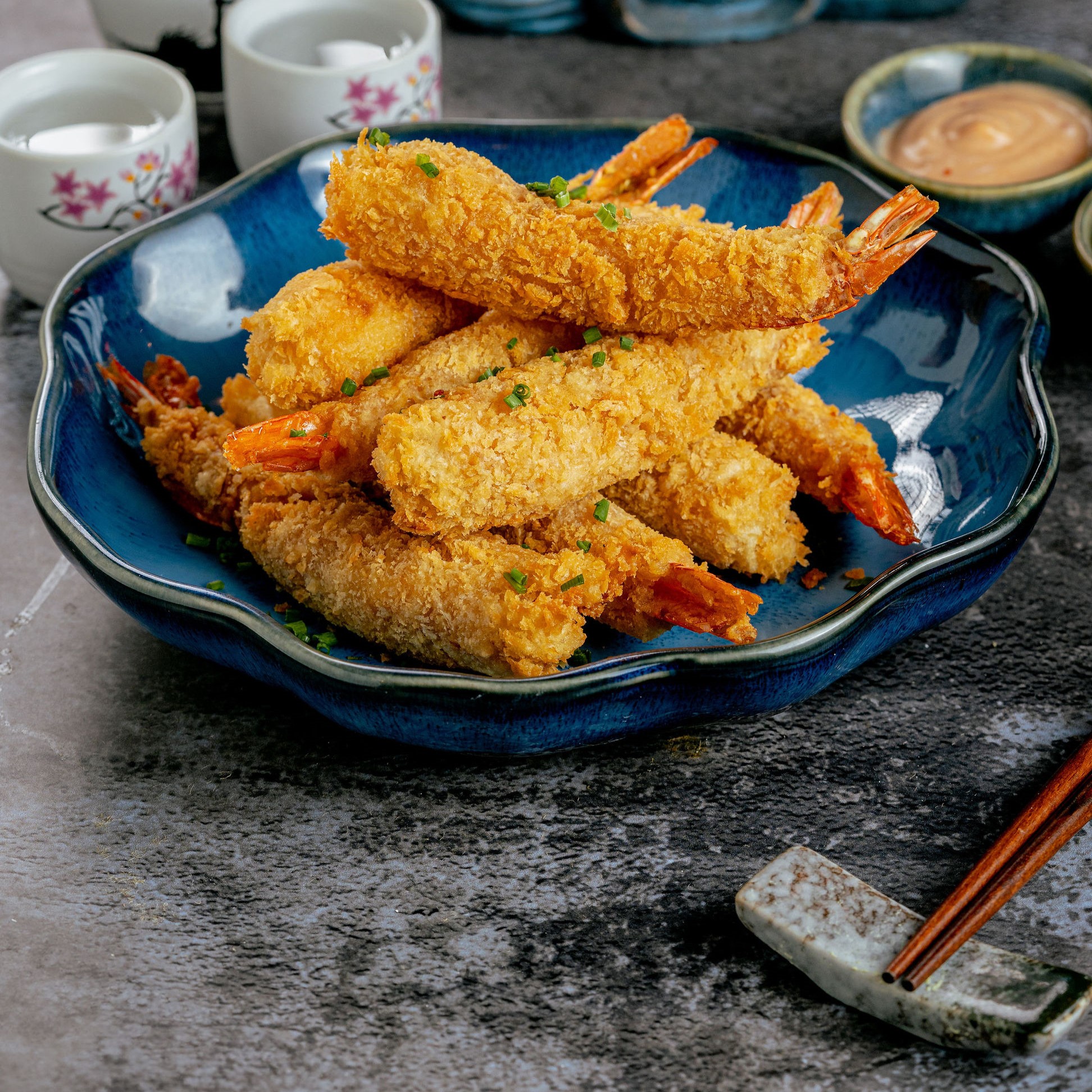 Langostinos al panko, sazonados y marinados, acompañados con salsa chipotle y salsa teriyaki.