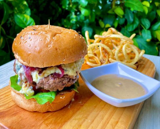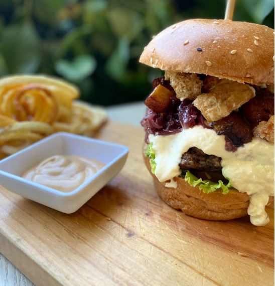 130 g De carne de chorizo de bondiola de cerdo, sour cream, queso mozarella, chimichurri de la casa, pan artersanal acompañado de papas en espiral.