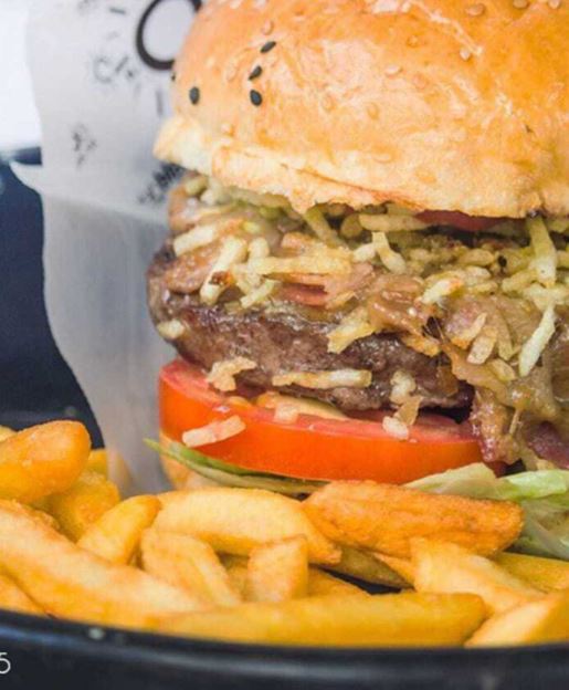 Concursante del Burger master 2019 viene con 200 Gramos de CARNE ARTESANAL DE LA CASA, QUE CONTIENE PECHO Y MORRILLO FINAMENTE MOLIDOS, pan artesanal, maduro calado con miel de panela, cebolla morada caramelizada en vino tinto, queso philadelphia, cuadritos de chicharrón, tomates y lechuga crespa. + papas en espiral