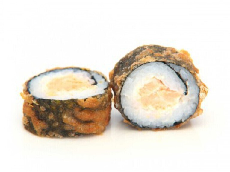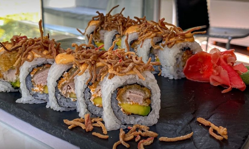 Salmón, atún y palmitos tempurados, aguacate, queso crema, ajonjolí.