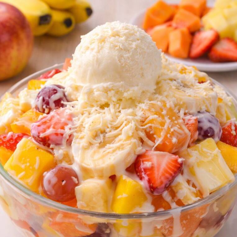 Deliciosa ensalada de 22 onzas, acompañada de banano, fresa, mango, manzana, papaya, melón, uva, piña, crema de leche, lechera, queso y una bola de helado a elección