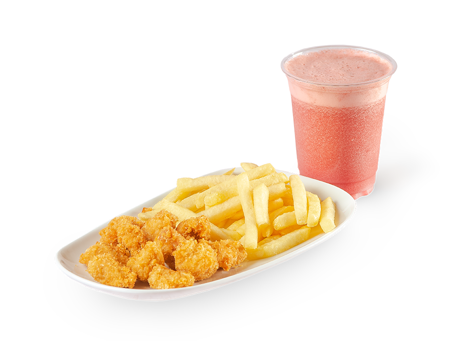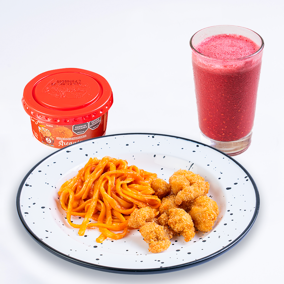 100 grs trocitos pollo apanados + Francesa o Fetuccini o Arroz Blanco o totopos + Jugo 16 onzas (Mora o Mango).