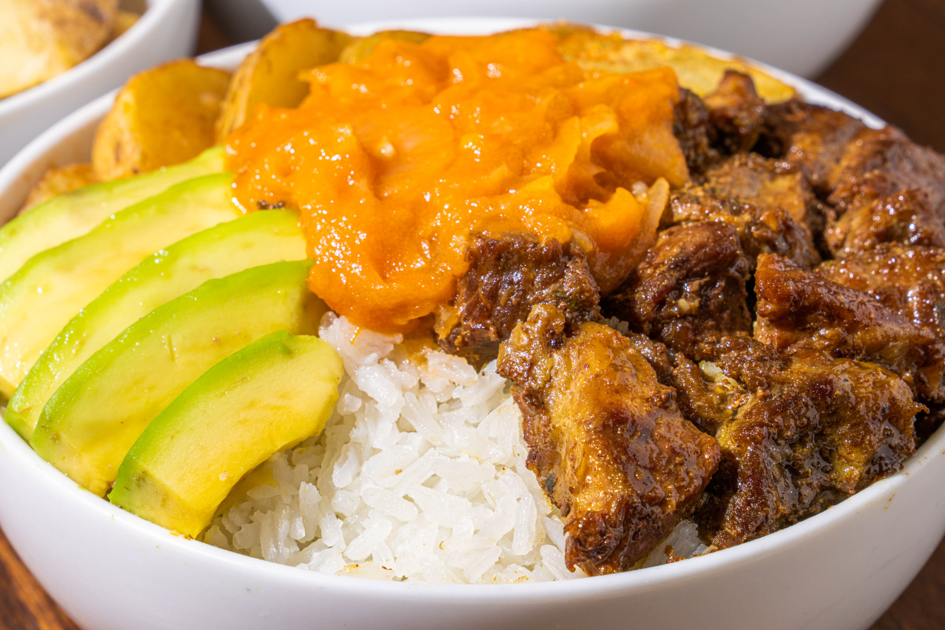 Sobrebarriga con salsa criolla, arroz blanco, julianas de aguacate, papa artesanal y bebida personal.