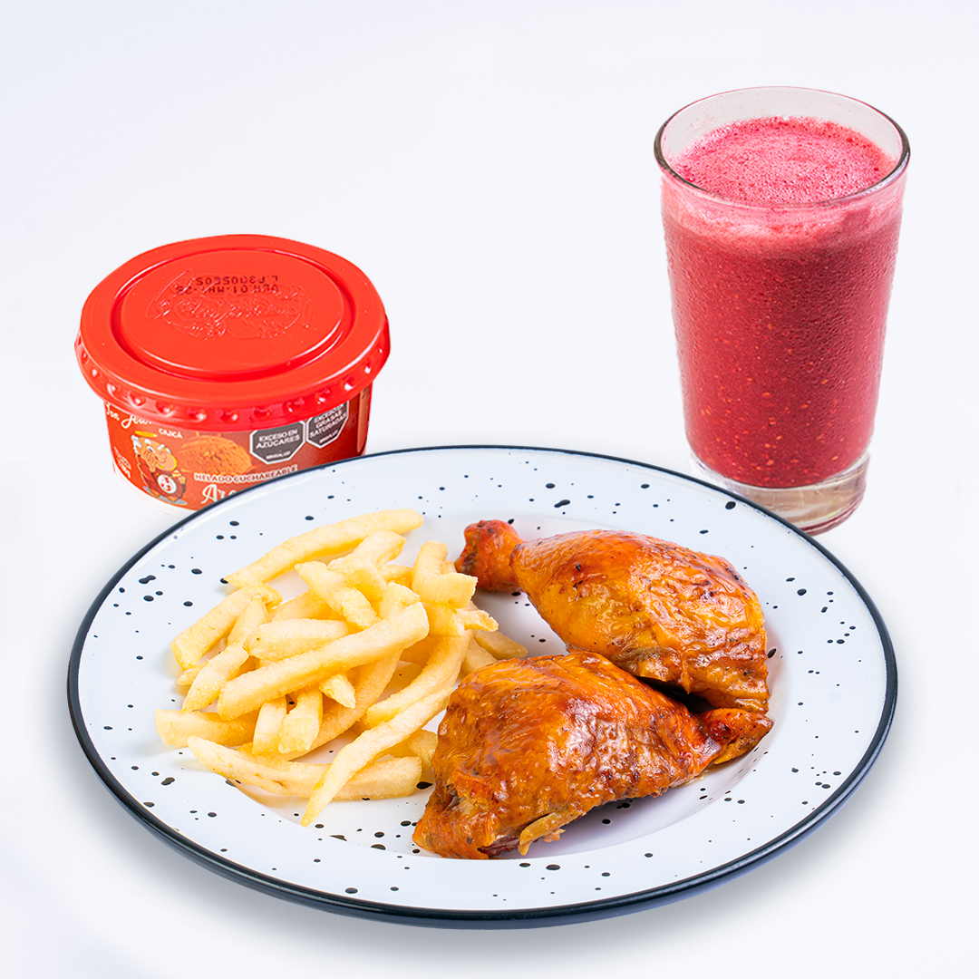 1/4 de Pollo Asado (Pierna Pernil o Pechuga Ala) + Francesa o Fetuccini o Arroz Blanco o totopos + Jugo 16 onzas (Mora o Mango) + Vaso de Helado San Jerónimo.