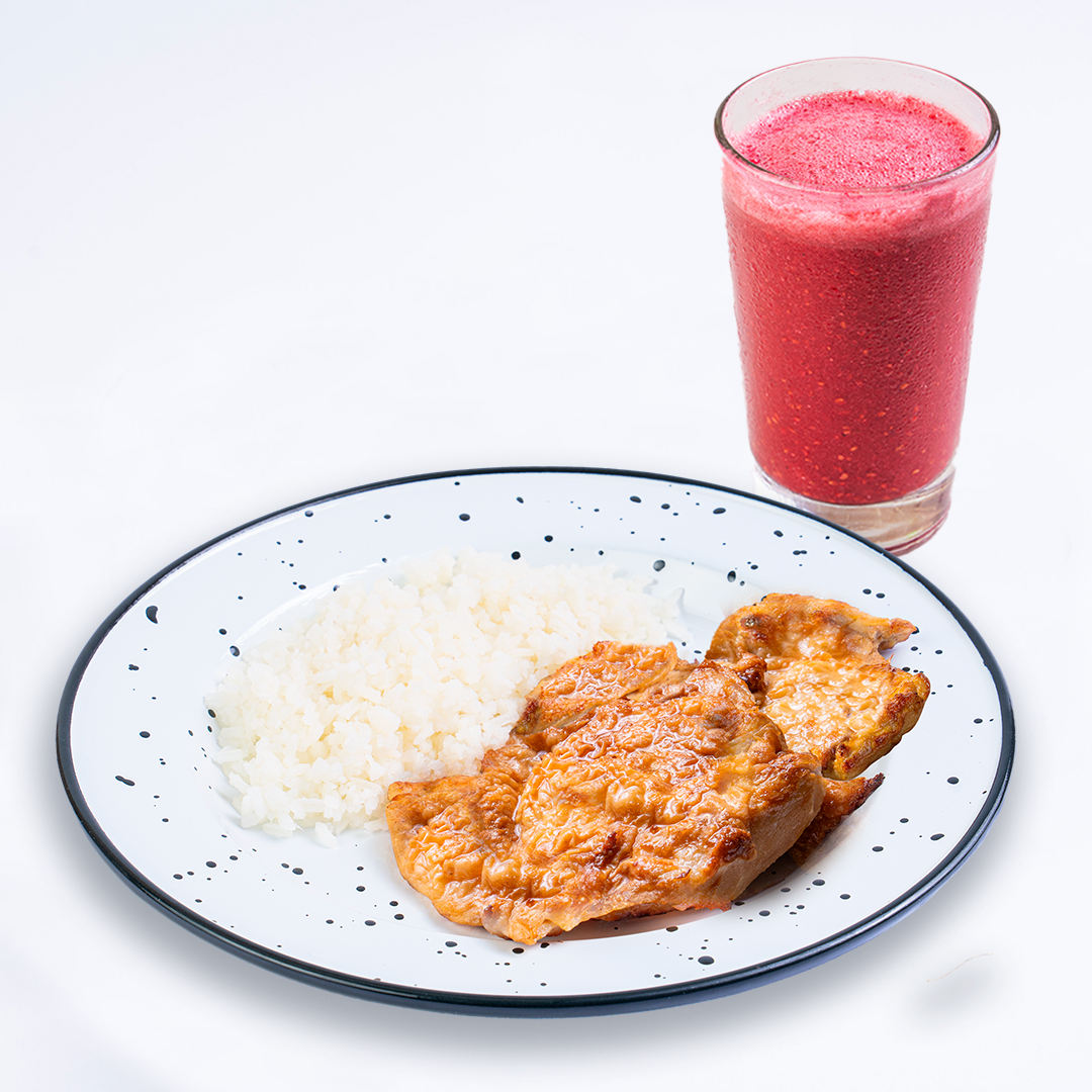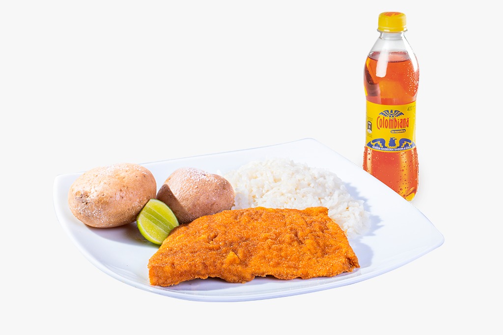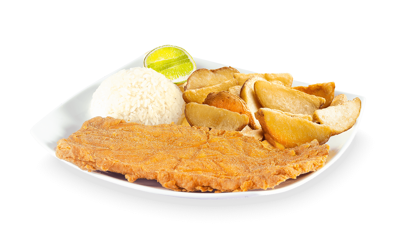 110g de cerdo apanado acompañado de arroz blanco, con 1 opción de acompañamiento entre 2 papas saladas o papa artesanal y 1 bebida personal.