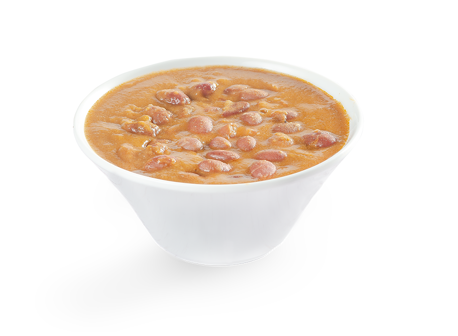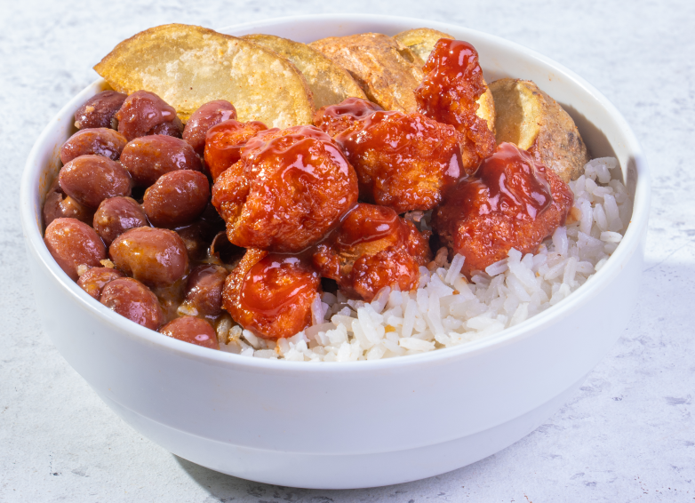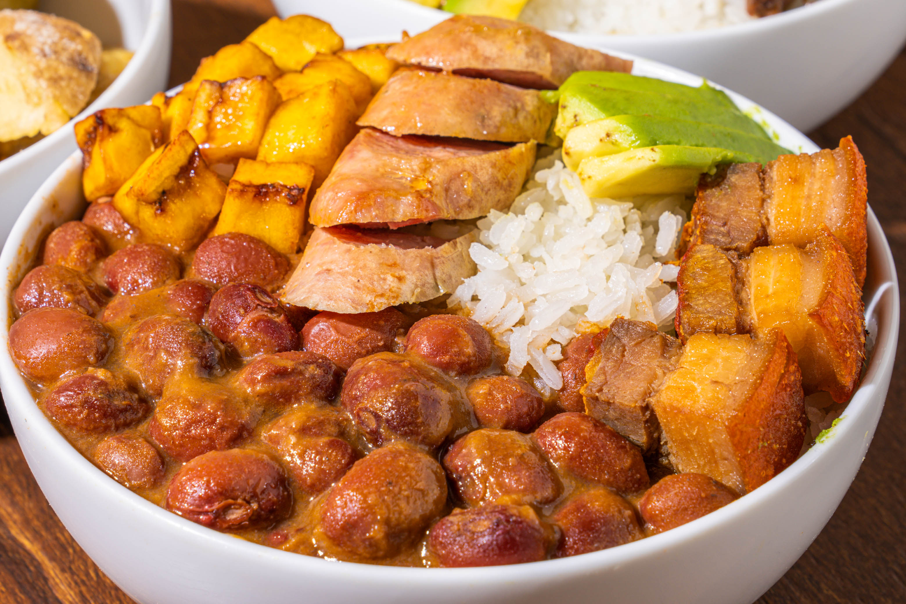 Frijol y arroz blanco, chorizo en rodajas, julianas de aguacate, chicharrón crocante, cubos de plátano maduro, con bebida personal.