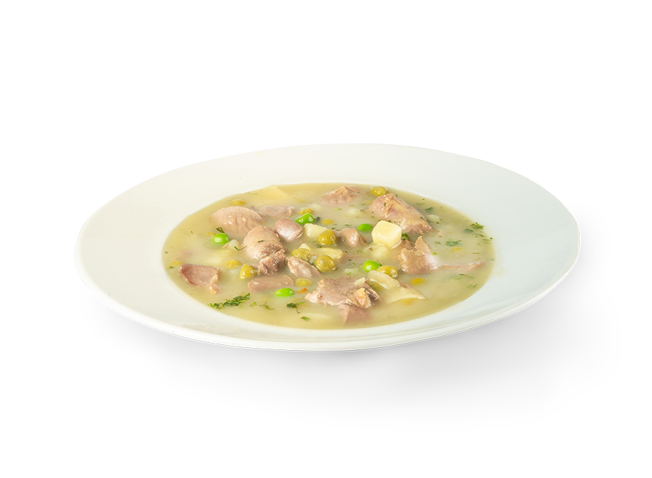Mollejas de pollo en un consomé con papa criolla y pastusa, arveja y un toque de cilantro.