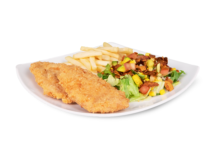 110g de Pechuga Apanada, con 2 opciones de acompañamiento.