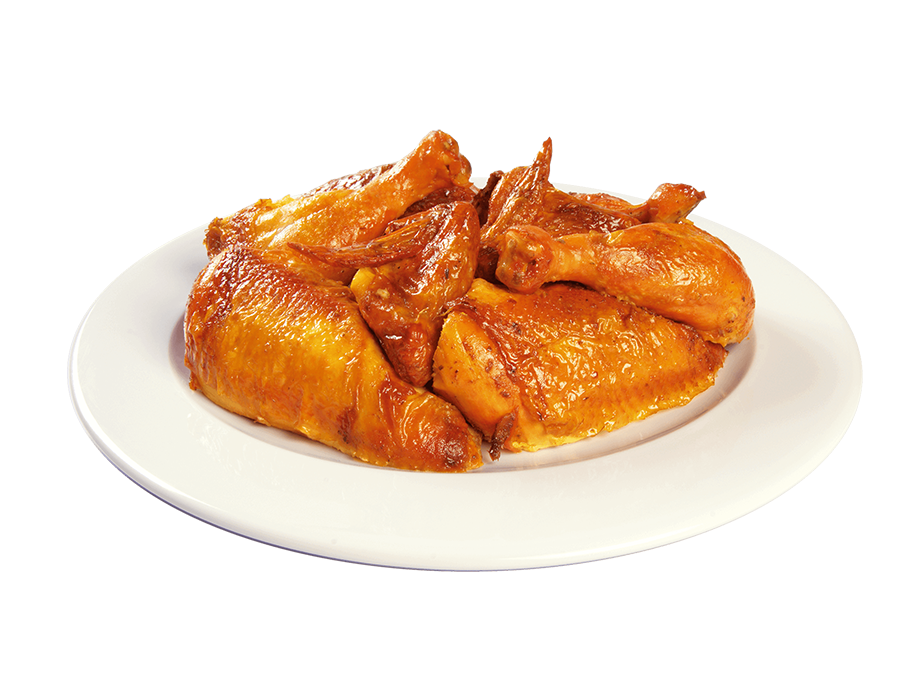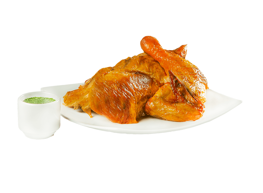 Medio Pollo Asado Bañado en nuestra Salsa BBQ acompañado de 1 porción de Papa Artesanal, 1 copa de Salsa BBQ y una bebida Personal en Botella.