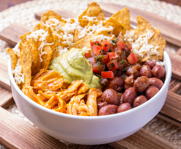 Pollo desmechado bañado en salsa buffalo, frijoles, guacamole, nachos con queso rayado y pico de gallo con bebida personal.