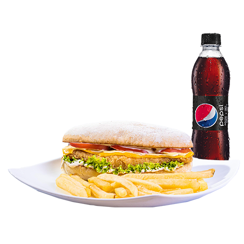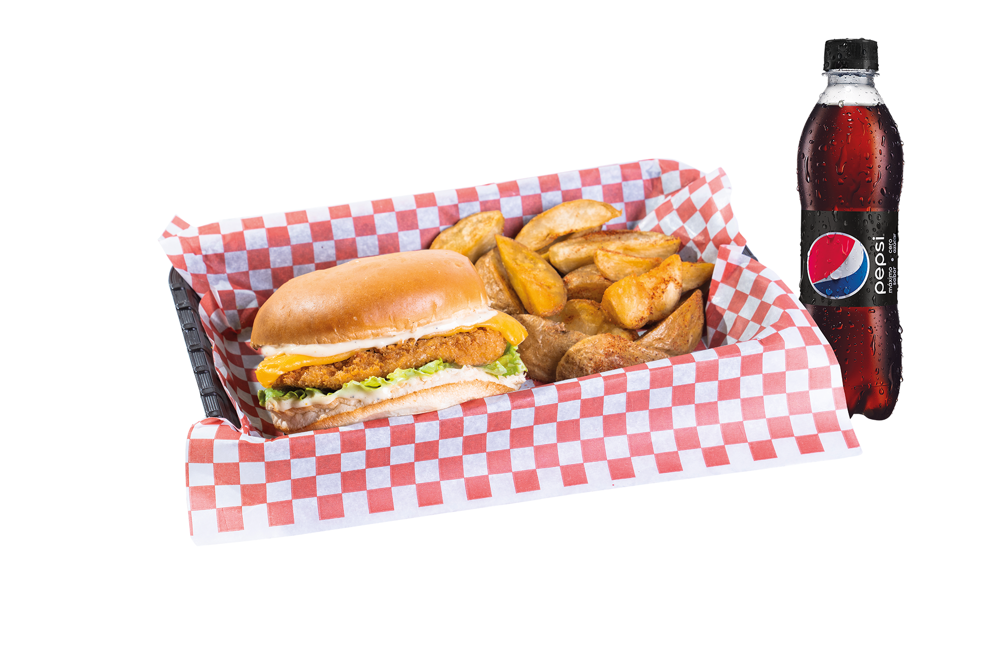 Milanesa de Pechuga de Pollo Apanada, queso tipo sabana, salsa de la casa en Pan de Papa, acompañado de papas artesanales y bebida persona.