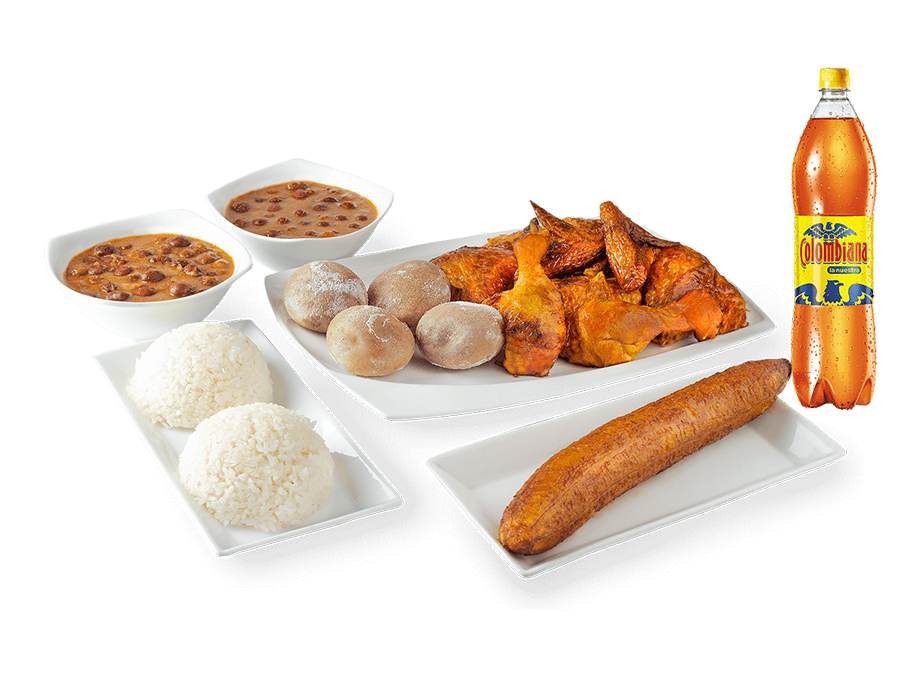 Pollo Asado + Porción Papa Salada + 2 porciones de Arroz blanco + 2 porciones de frijol + plátano Maduro + Bebida 1,5 lts.