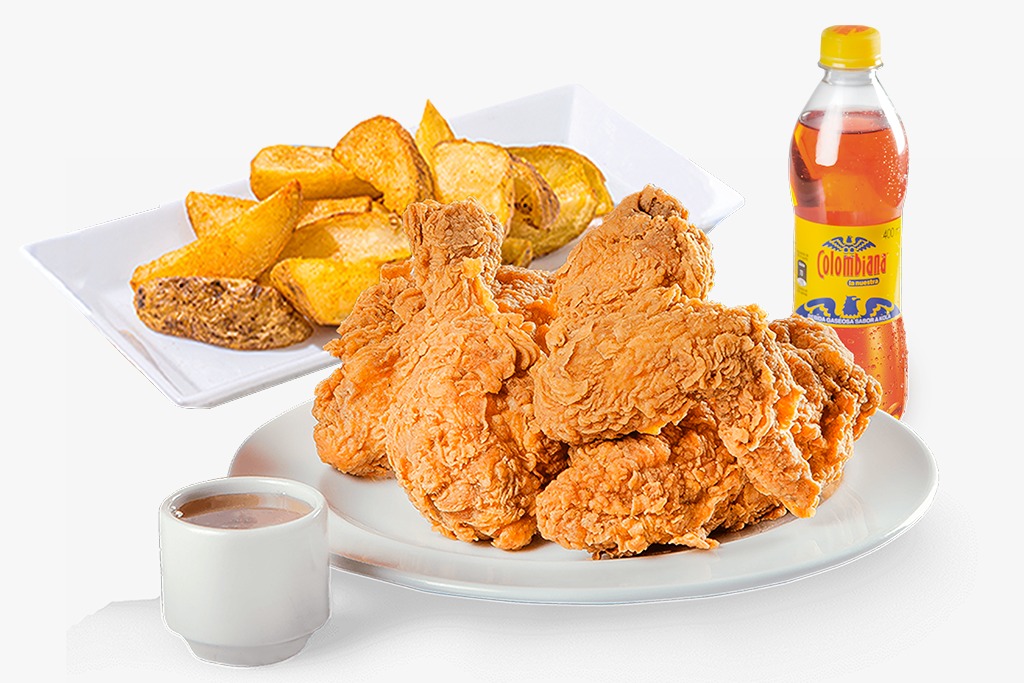 1/2 Pollo Apanado acompañado de papa artesanal y 1 Bebida personal en Botella.