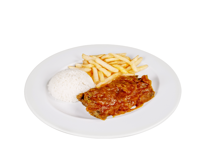 150g de Sobrebarriga, porción de Arroz, 1 Acompañamiento (Dos Papa Saladas, Porción de Francesa, o papa artesanal.).