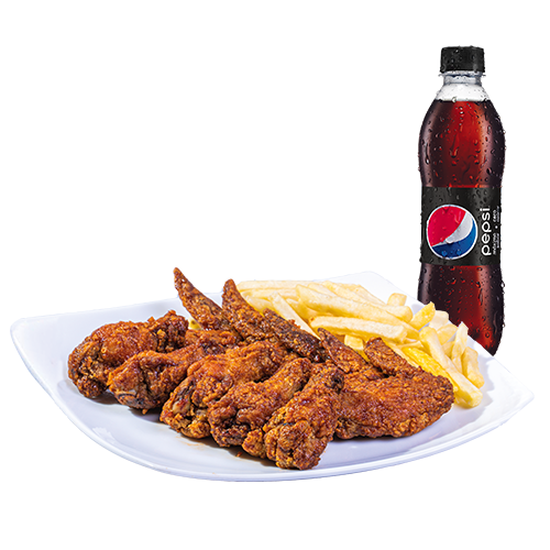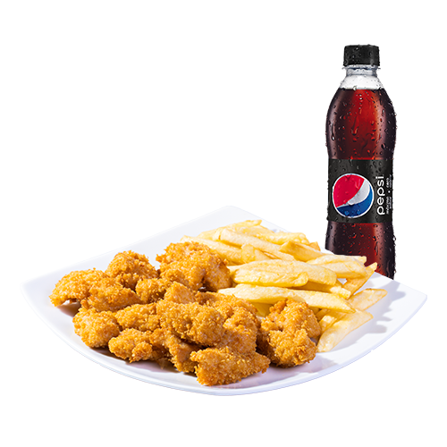 200 grs Trocitos de Pollo Apanados + 30 grs Salsa (BBQ, Miel Mostaza o Buffalo) + Francesa o Papa Artesanal o Totopos + Bebida personal en botella.