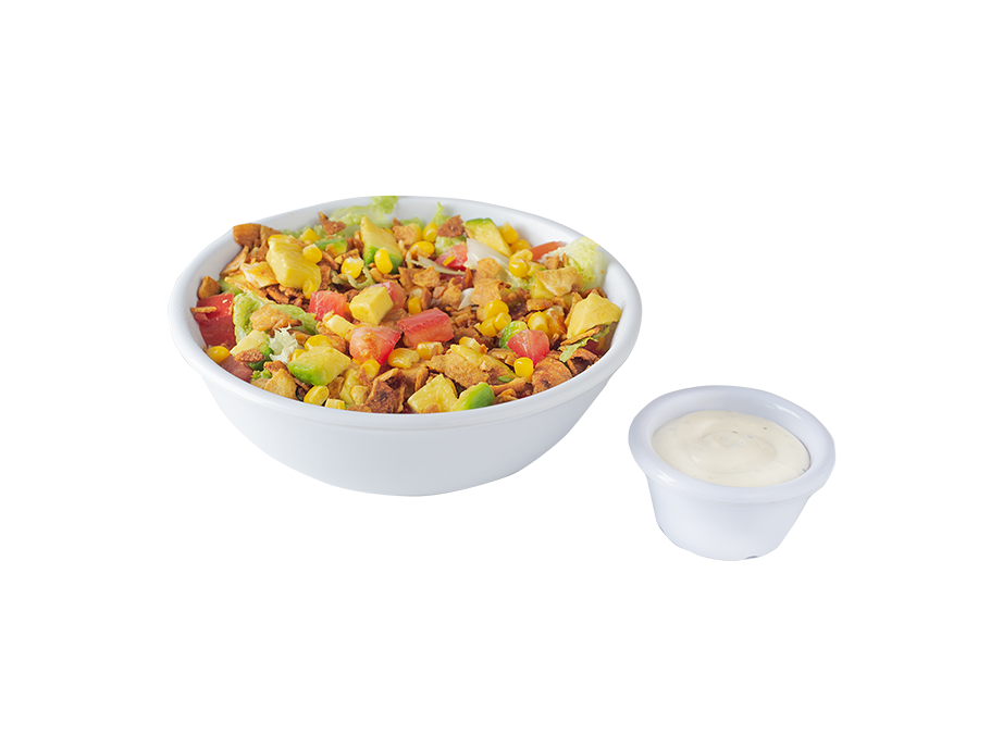Mezcla de lechugas+ Tomate en cubos + Aguacate + Maíz tierno + Chips de plátano + Vinagreta de la casa.