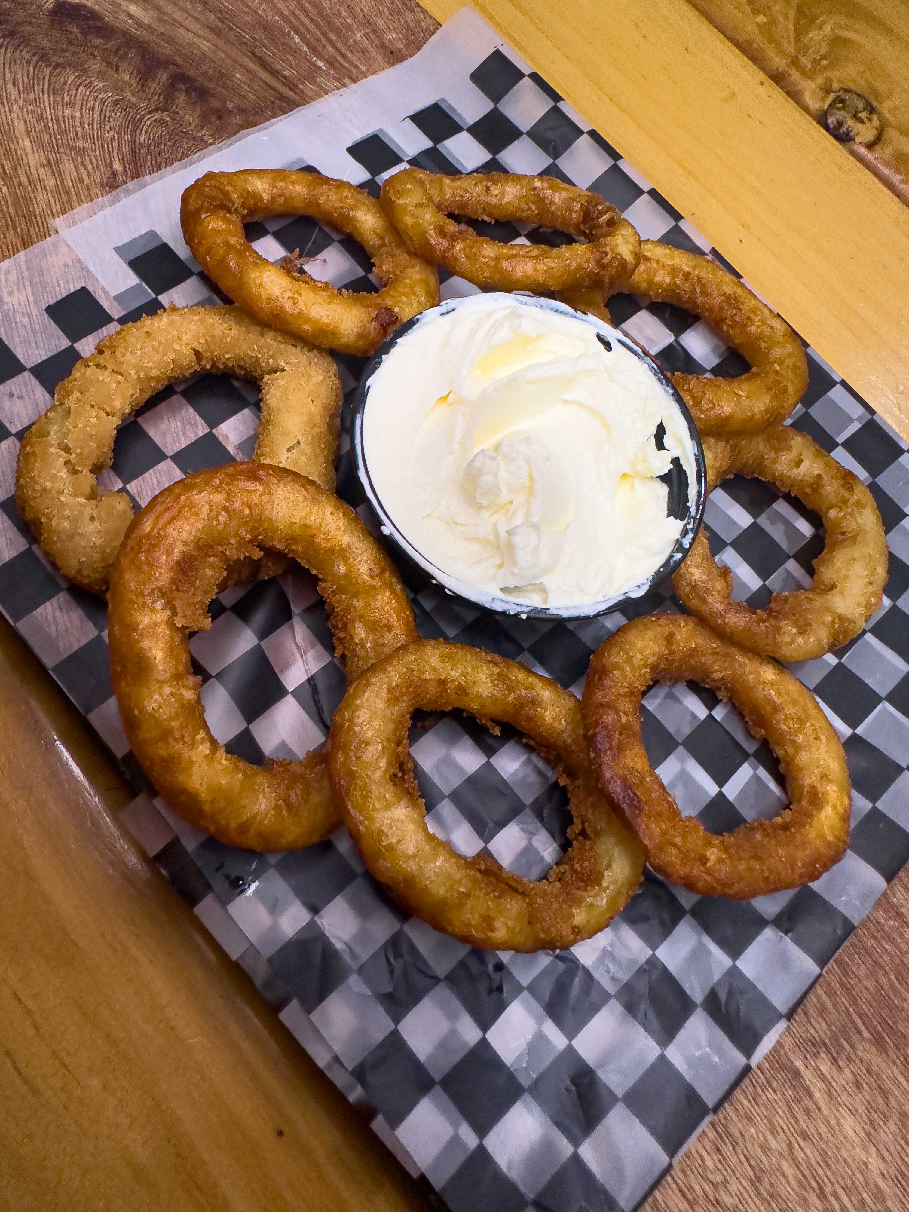 Pan brioche, carne 100% angus doble tocineta, aros de cebolla, baño de salsa 4 quesos, tomate, cebolla, lechugas fresca, salsa de la casa.
