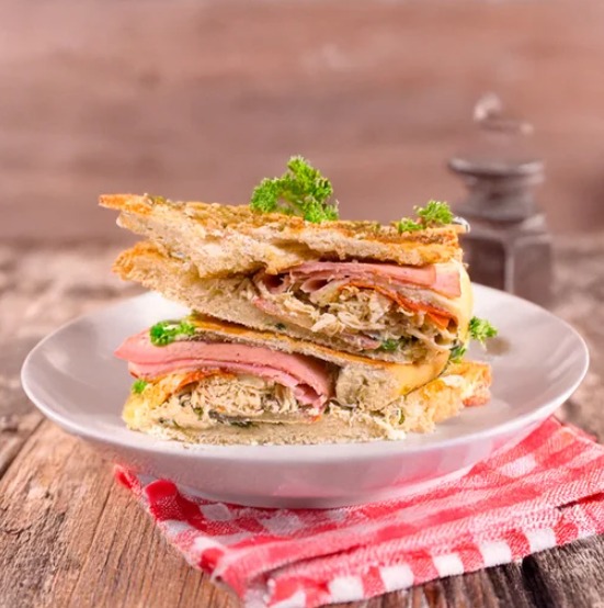 Pan baguettine 22 cm, salsa de ajo artesanal, pollo desmechado, pepperoni, jamón de cerdo, queso mozzarella, tomate, lechuga.