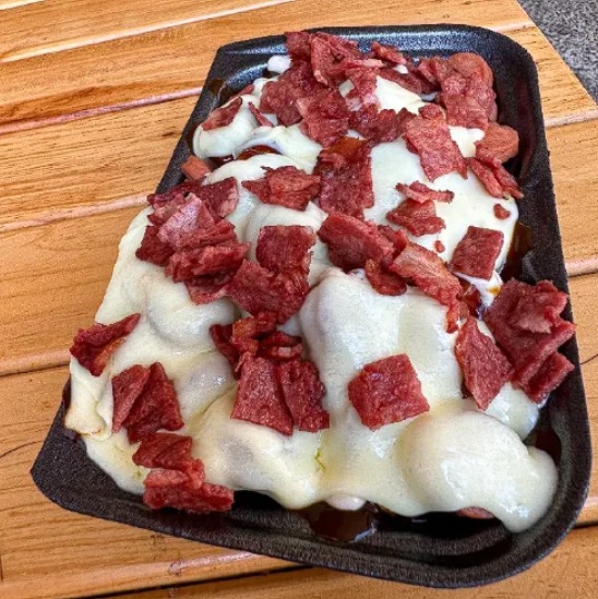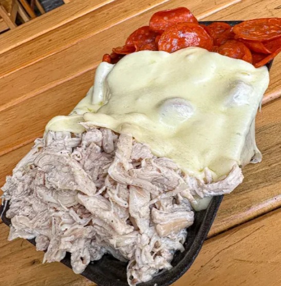 Papas a la francesa, salchicha americana, pollo desmechado bañado en salsa de ajo artesanal, queso mozzarella fundido y pepperoni.
