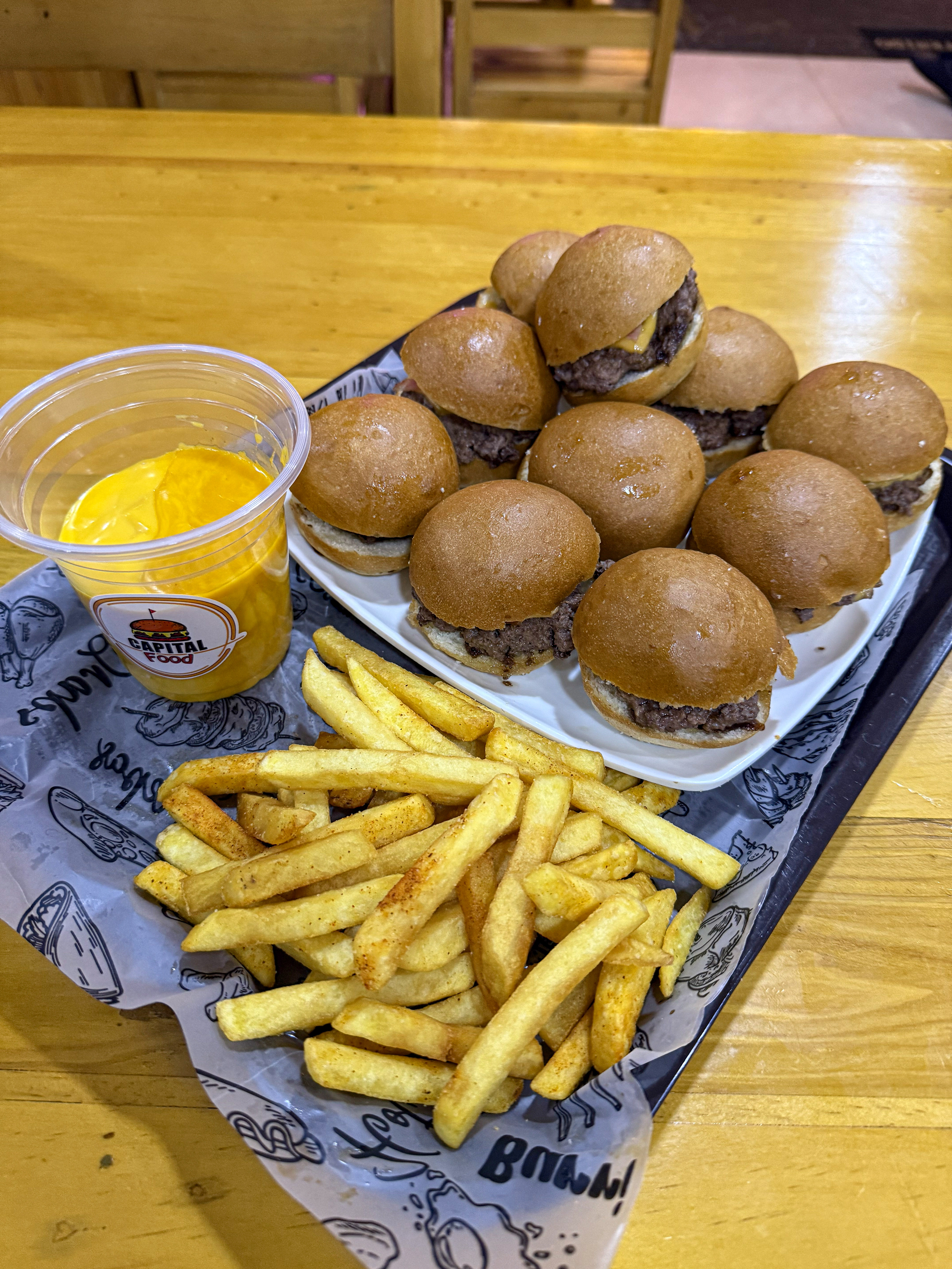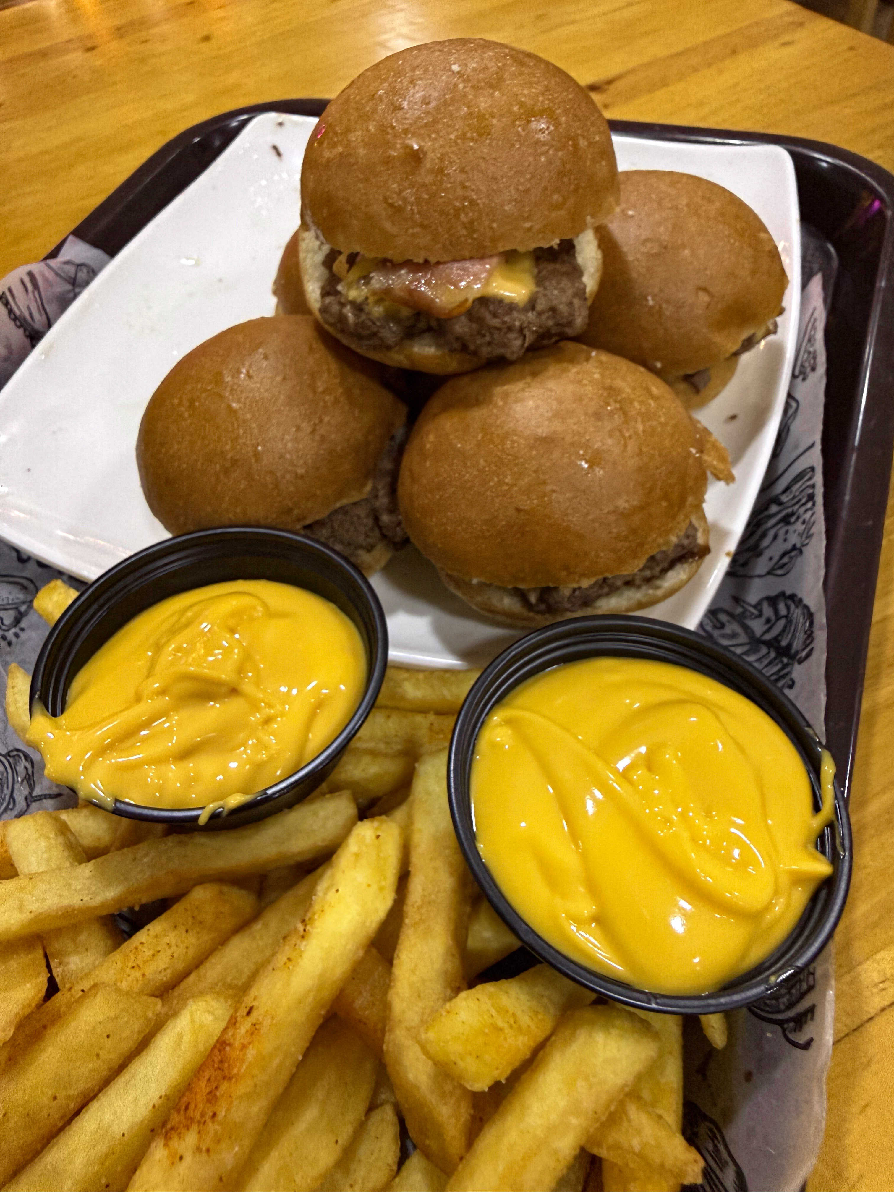 Baby Burger x10 acompañado de 10 mini Burgers con pan brioche, carne artesanal, queso americano, tocineta y salsa bbq. Acompañado de papas a la francesa y un vaso de queso cheddar.