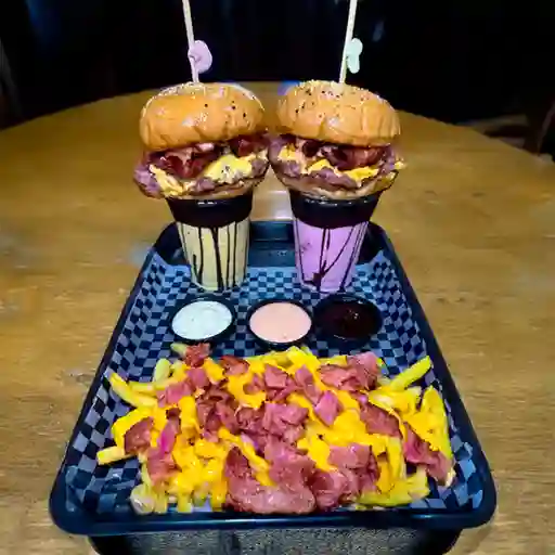 Hamburguesa americana*2 + Malteada de Chocolate 16onz*2 + 200 gr de Papas Chedar y Tocineta.*2