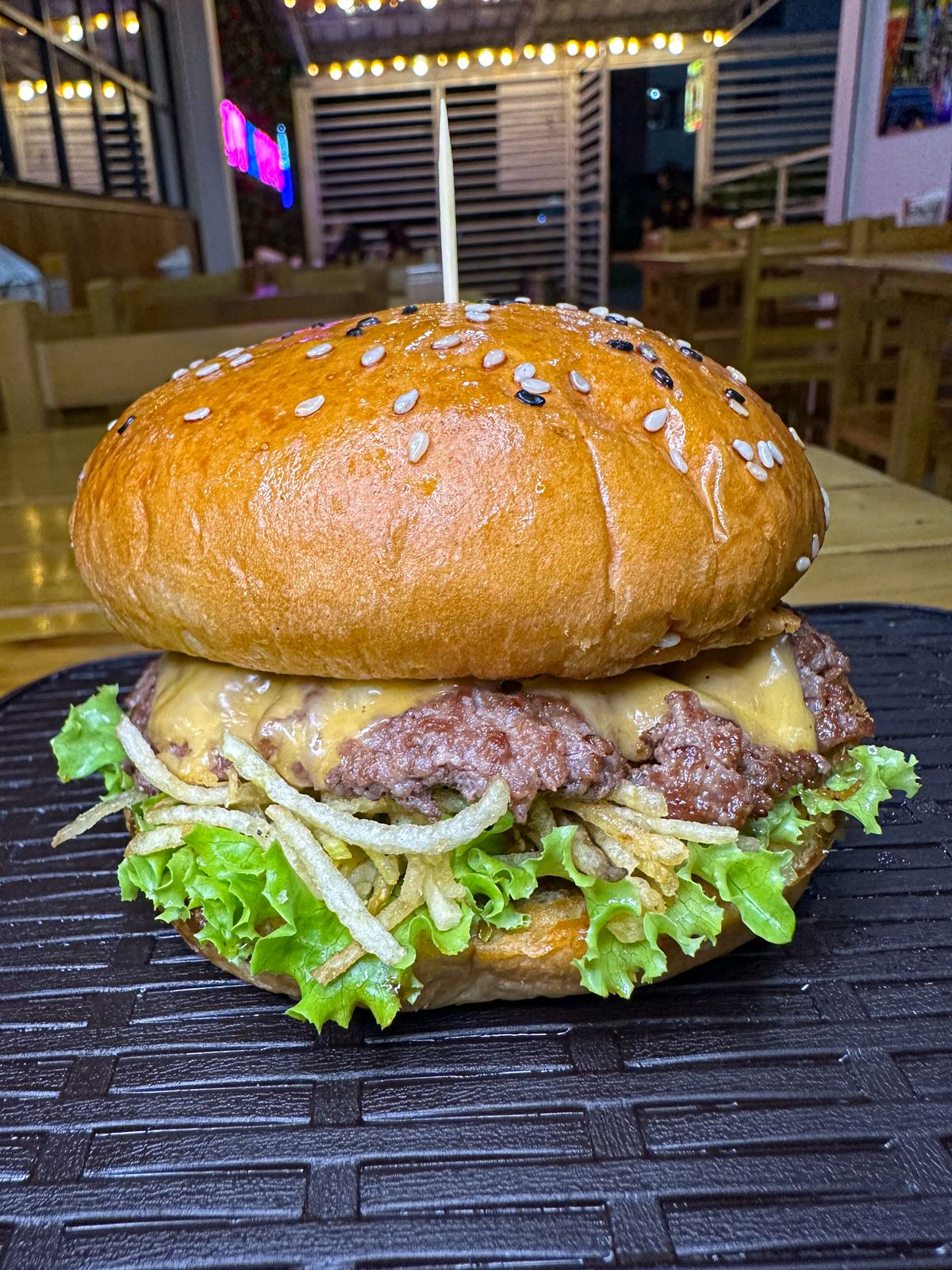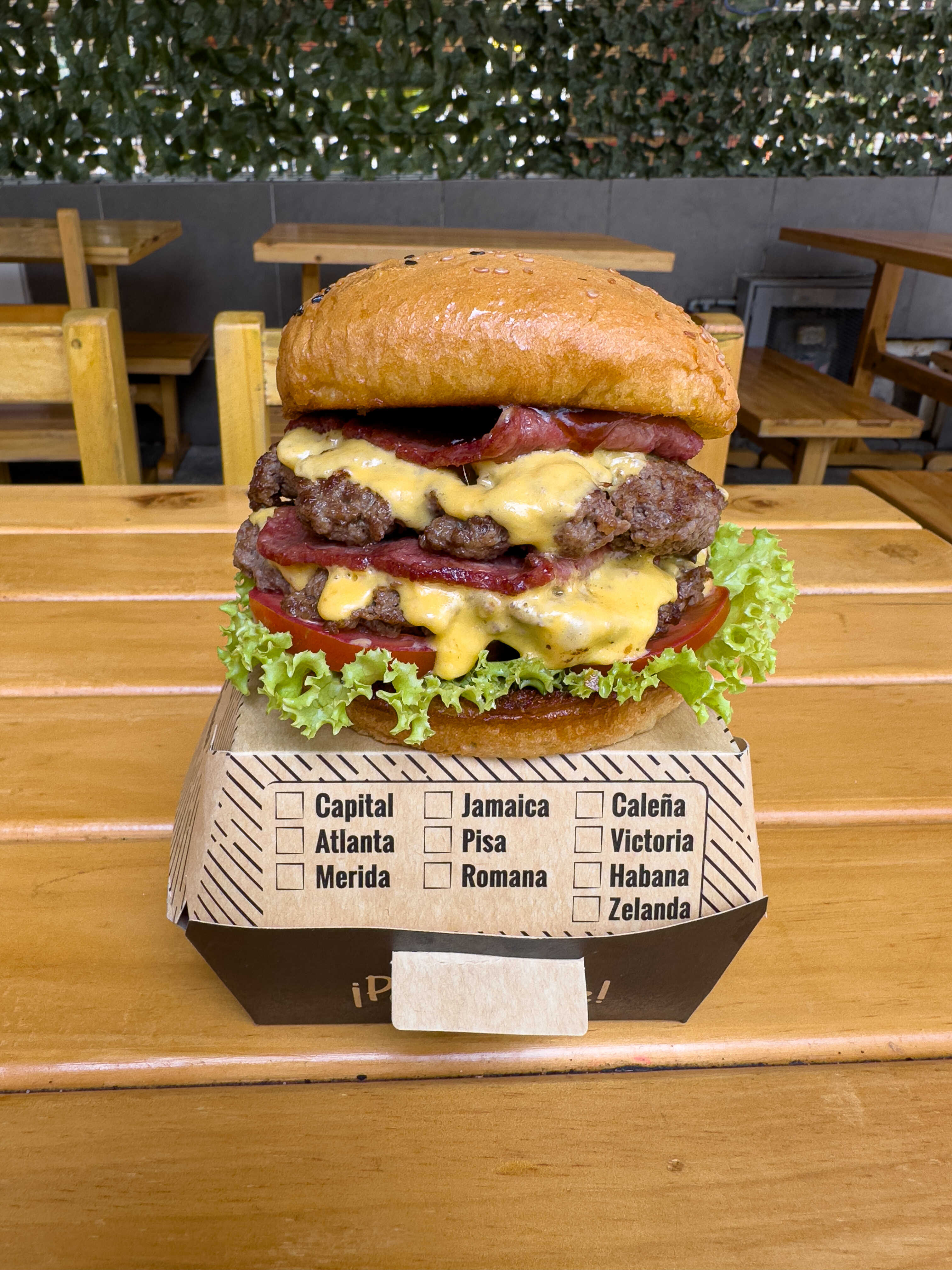 Pan brioche, doble carne 100% angus, doble tocineta de cerdo, doble queso tipo americano, tomate, cebolla, lechuga, salsa de la casa.