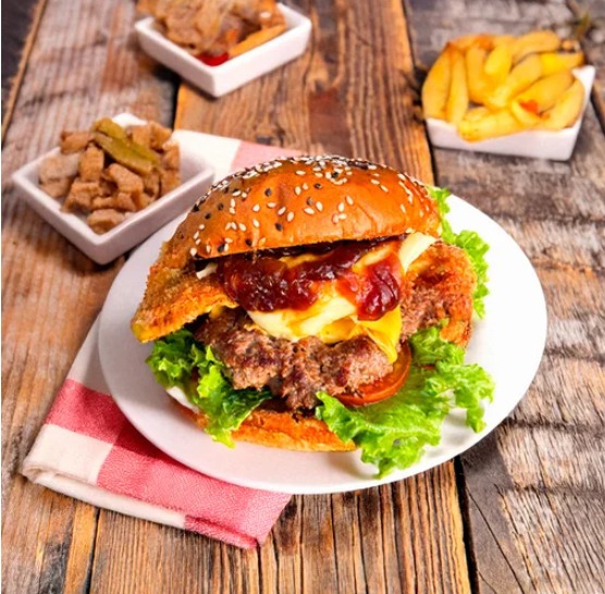 Pan brioche, carne 100% angus, queso tipo philadelphia, tocineta, piña calada artesanal, tomate, cebolla, lechuga, salsa de la casa.