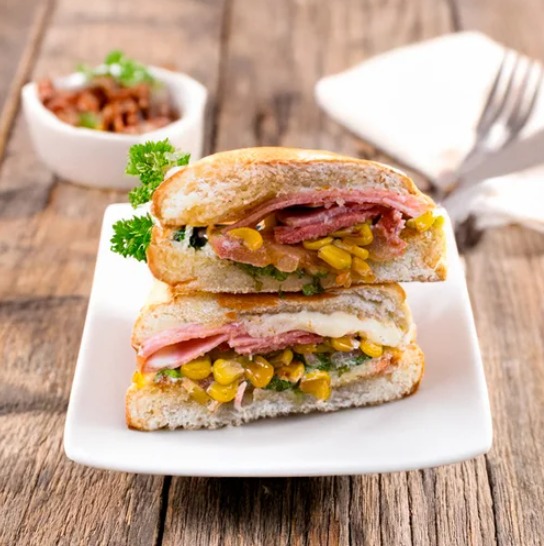 Pan baguettine 22 cm, salsa de ajo artesanal, maíz dulce, tocineta premium, jamón de cerdo, queso mozzarella, tomate, lechuga.