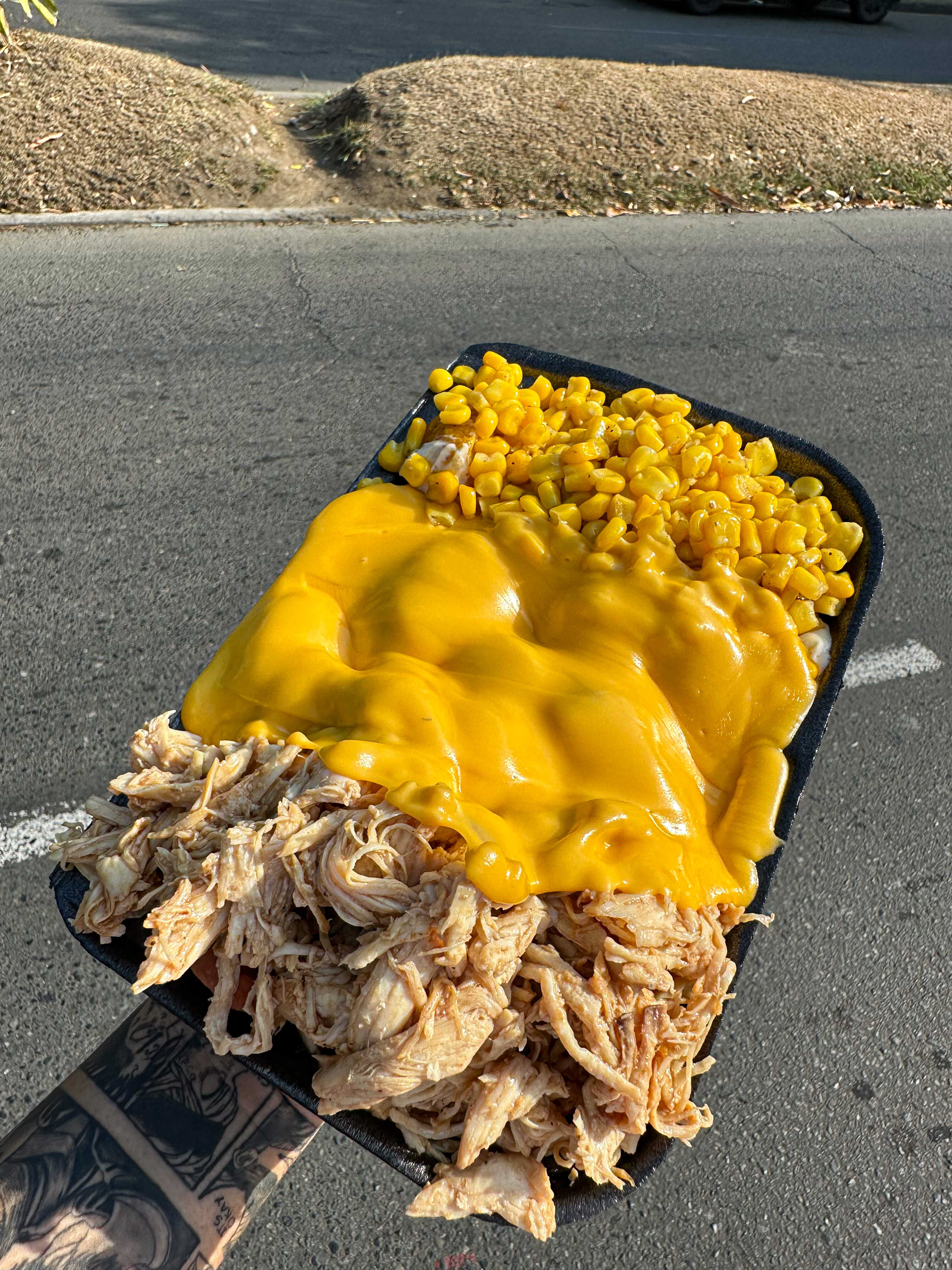 Papa a la francesa, salchicha americana, pollo desmechado en salsa BBQ, salsa 4 quesos de la casa acompañada de maicitos en mantequilla y salsas de la casa.