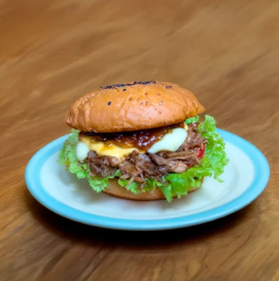 Pan brioche, 150gr de pulled pork (cerdo en BBQ), queso americano, queso mozzarella, cebolla caramelizada artesanal, tomate, cebolla, lechugas, salsa de la casa.
