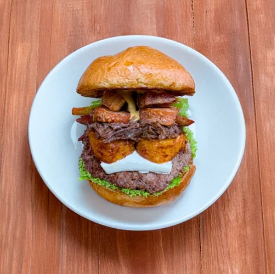 Pan brioche, carne 100% angus, ropa vieja, res desmechada en BBQ, queso tipo philadelphia, rodajas de maduro, chicharron carnudo de cerdo, tomate, cebolla, lechuga, salsa de la casa.