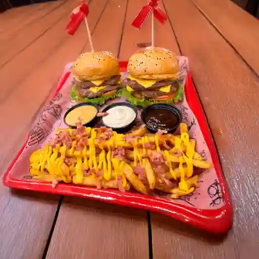 Combo Para Compartir X3 🍔🍟 (Burger Box) el cual contiene 3 deliciosas hamburguesas para compartir acompañado de una porción de papas y salsas de la casa.