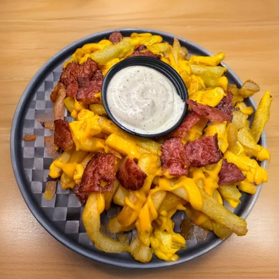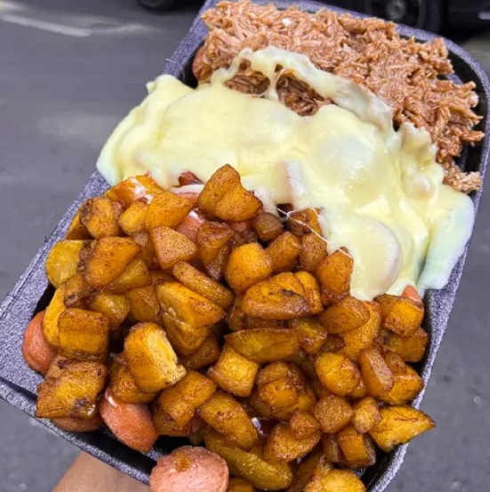 Papa frita con costilla ahumada bañada en salsa BBQ, queso mozzarella fundido y trocitos de madurito.