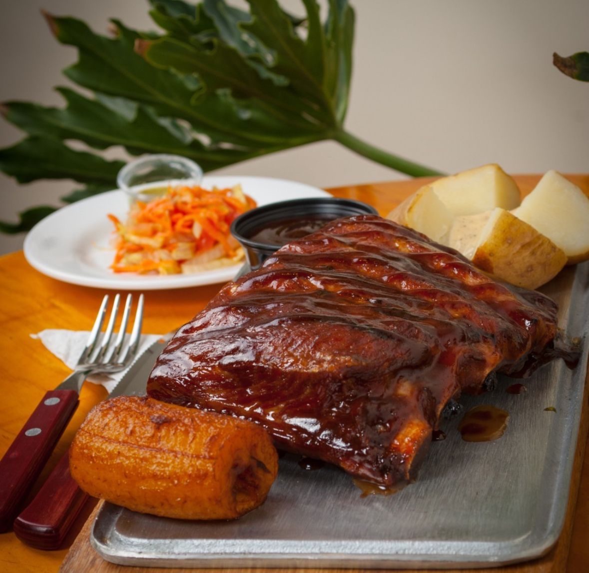 400 g De costilla st.louis a la BBQ, acompañada de papa y maduro.
