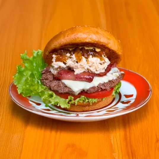 Pan brioche, carne 100% angus, queso americano, filete de pollo apanado, queso mozzarella, cebolla caramelizada, lechuga, tomate y salsa de la casa.