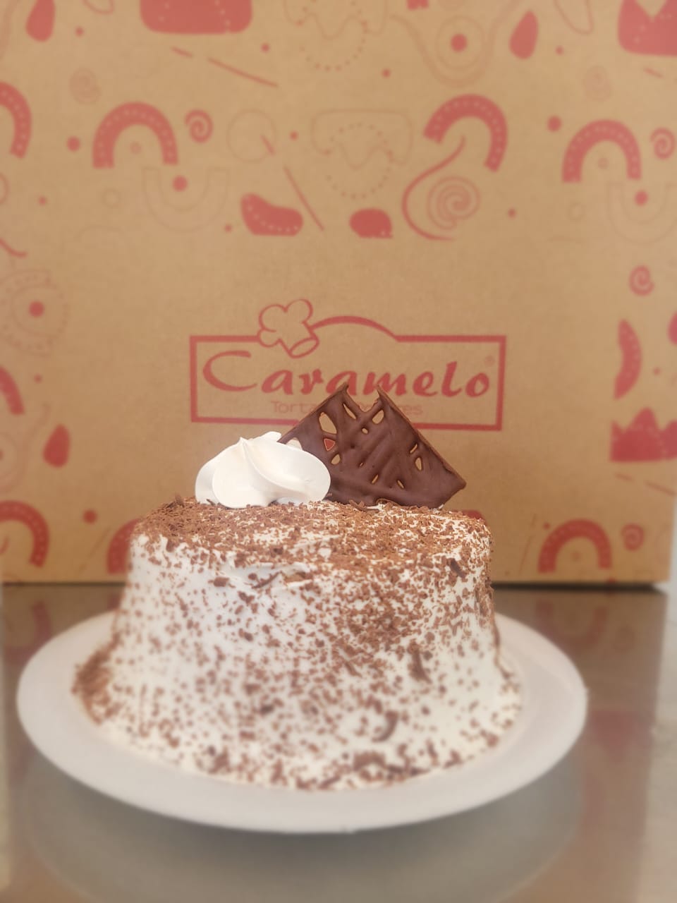 Delicioso Postres en molde redondo con base de bizcochuelo, Exotico postre a base de bizcochuelo mojado con licor de café y relleno de queso crema y chocolate, 400 grs. Para 6 a 8 porciones.