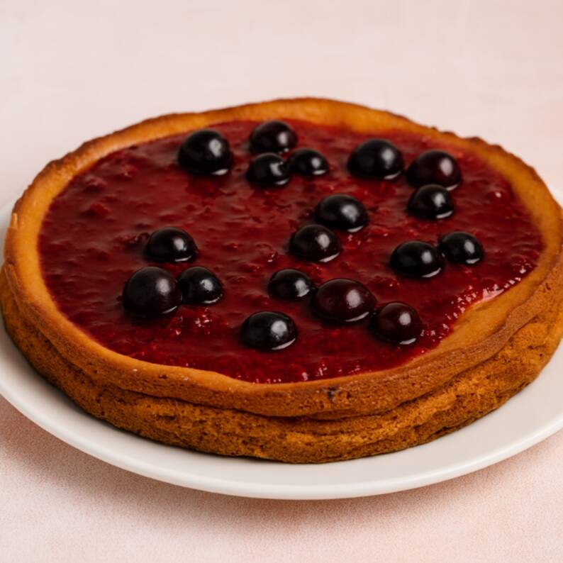 Elegante postre con una base de galleta de torta más un batido de queso crema con salsa y trozos de frutos rojos. Tamaño:1/2 libra