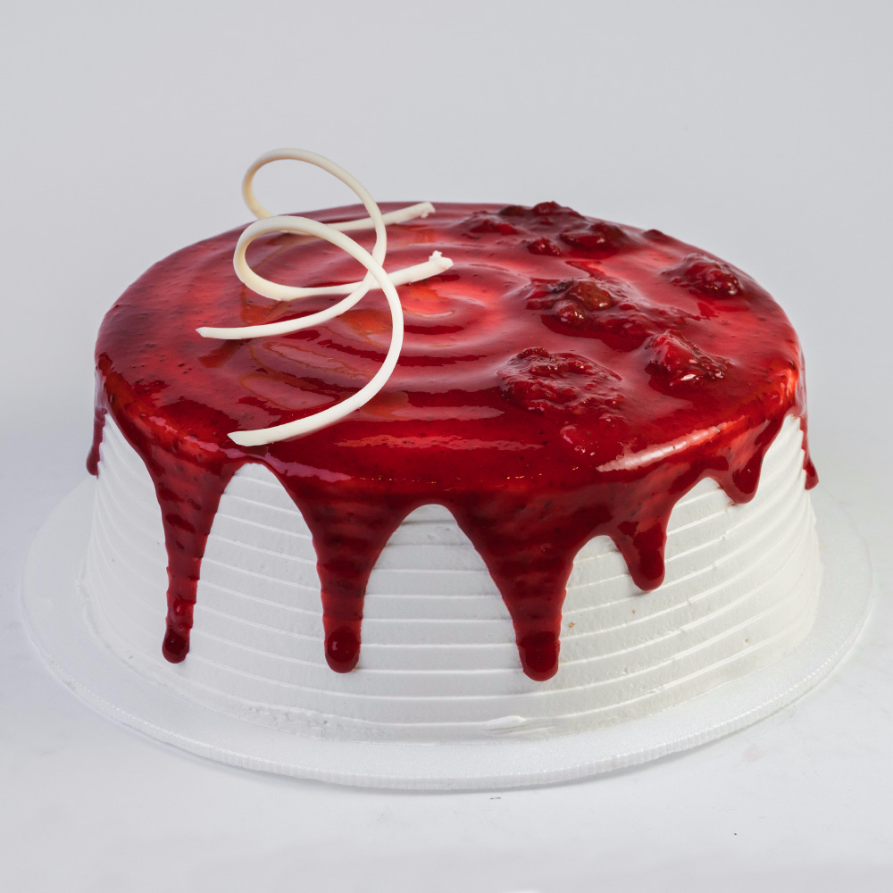 Torta blanca con doble relleno de suave crema inglesa y deliciosa salsa de fresa