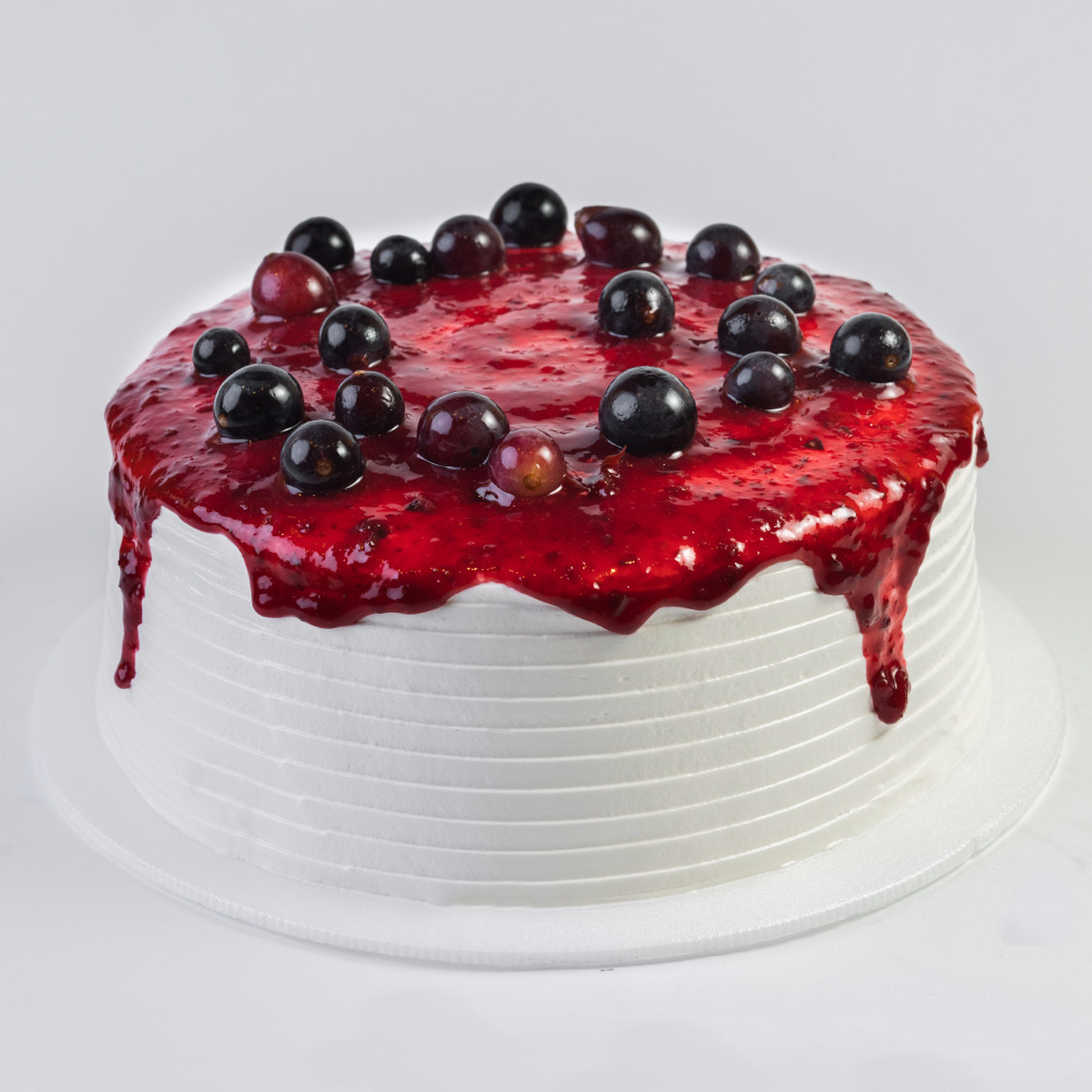 Delicioso Postre en molde redondo y tienen una base de bizcochuelo, Suave y cremoso postre con trozos de uva, mora, fresa y agras, 400 grs. Para 6 a 8 porciones.