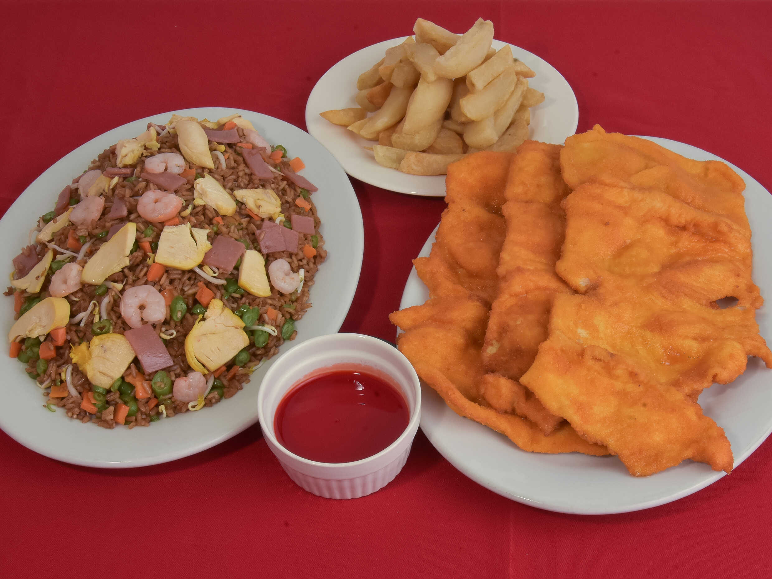 1800 gramos de Arroz Chino mas Chuleta de Pollo y Papas a la francesa.