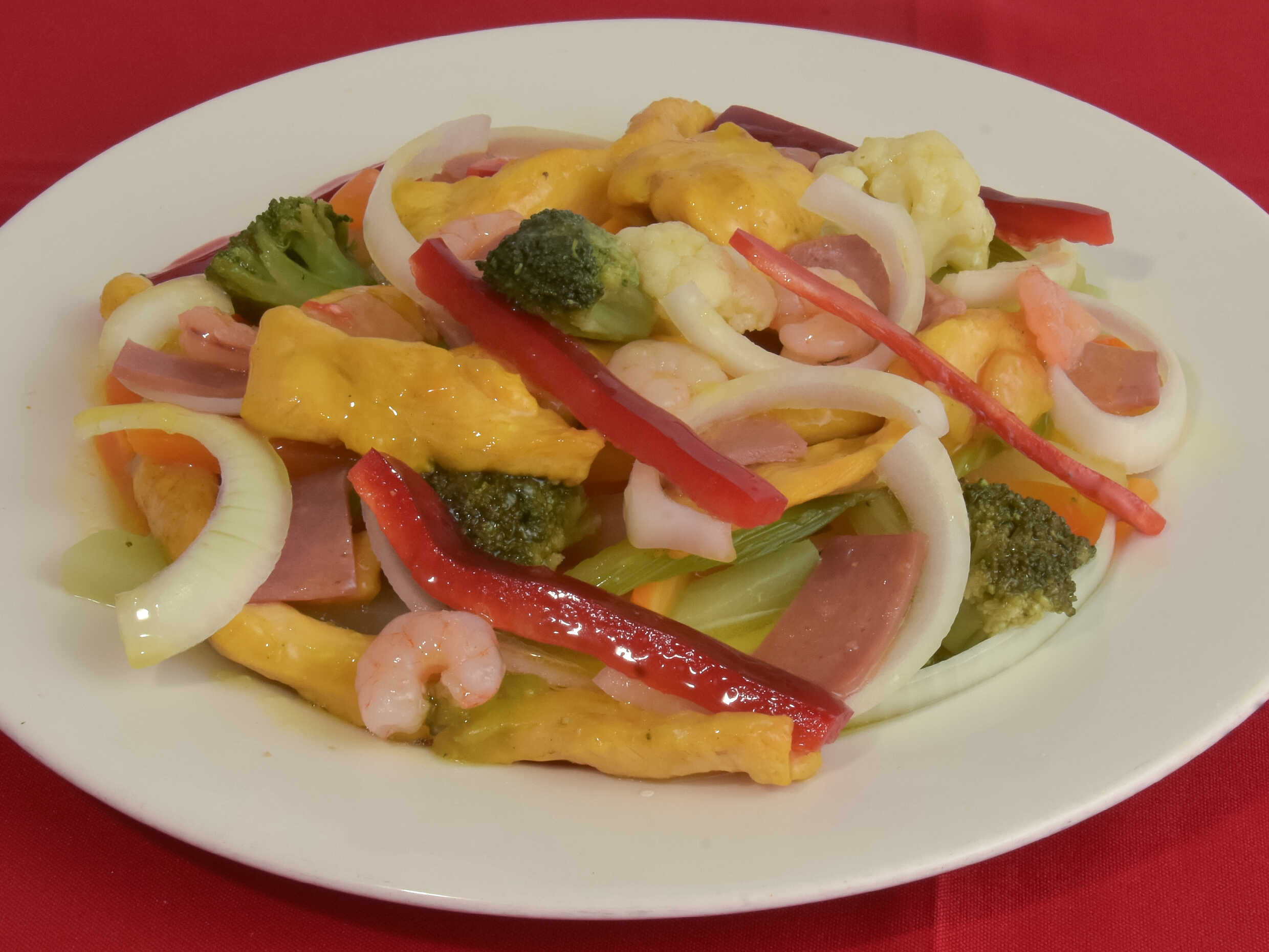 900 gramos de Arroz Chino con Pollo, Camarón, Cerdo, Jamón y Tortilla de Huevo.