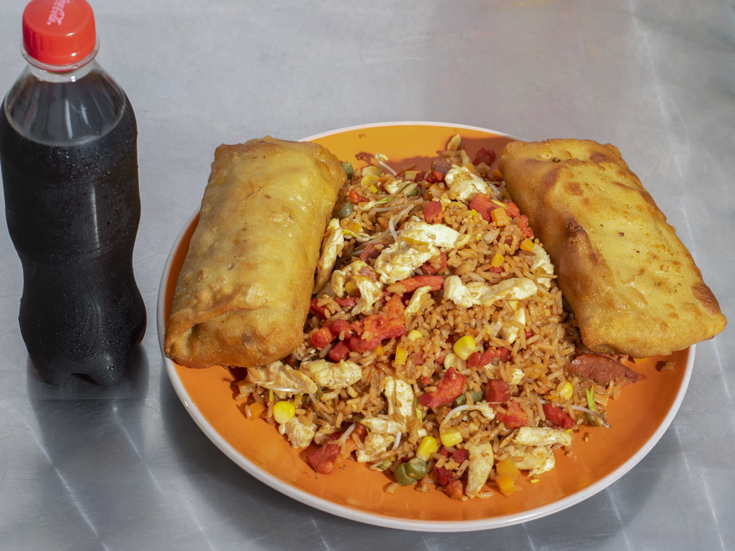 Arroz chino elaborado con Arroz, pollo, cerdo, jamón, zanahoria habichuelas, raíz china, costilla ahumada, papas a la francesa y gaseosa para dos personas