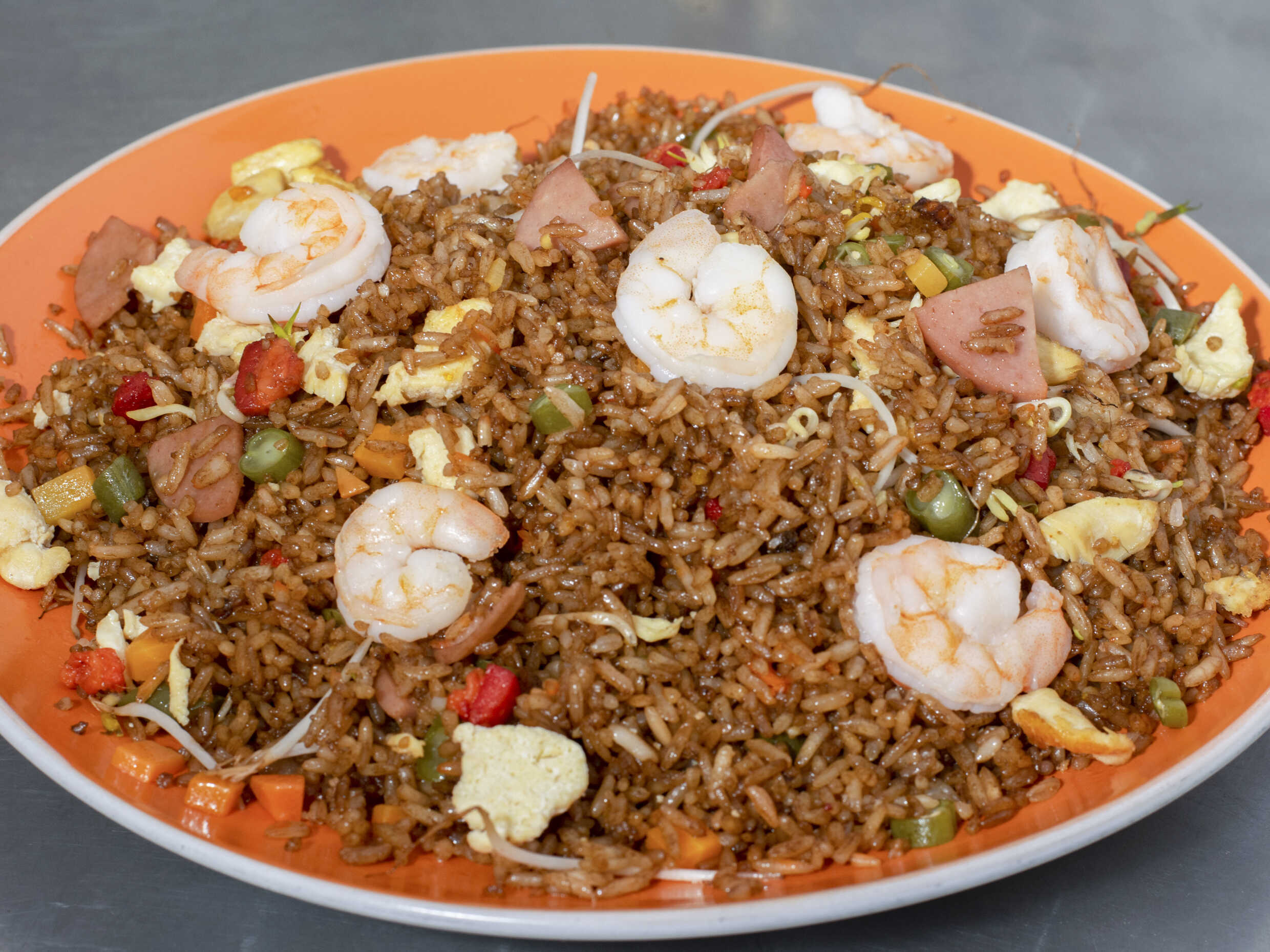 Arroz, pollo, cerdo, camarón verduras jamón raíz china...
