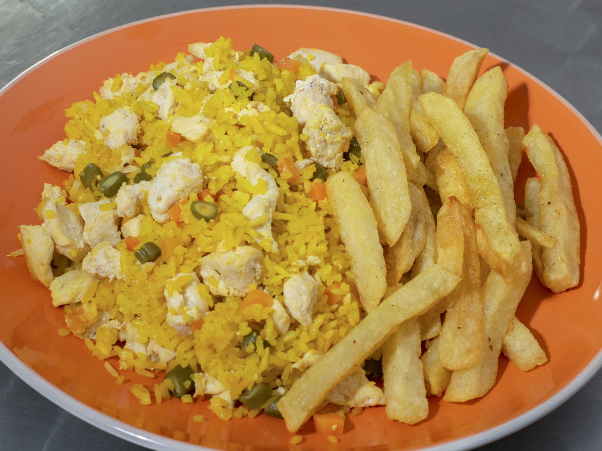 Arroz con Pollo elaborado a base de arroz, verduras y pollo, acompañado con papas a la francesa