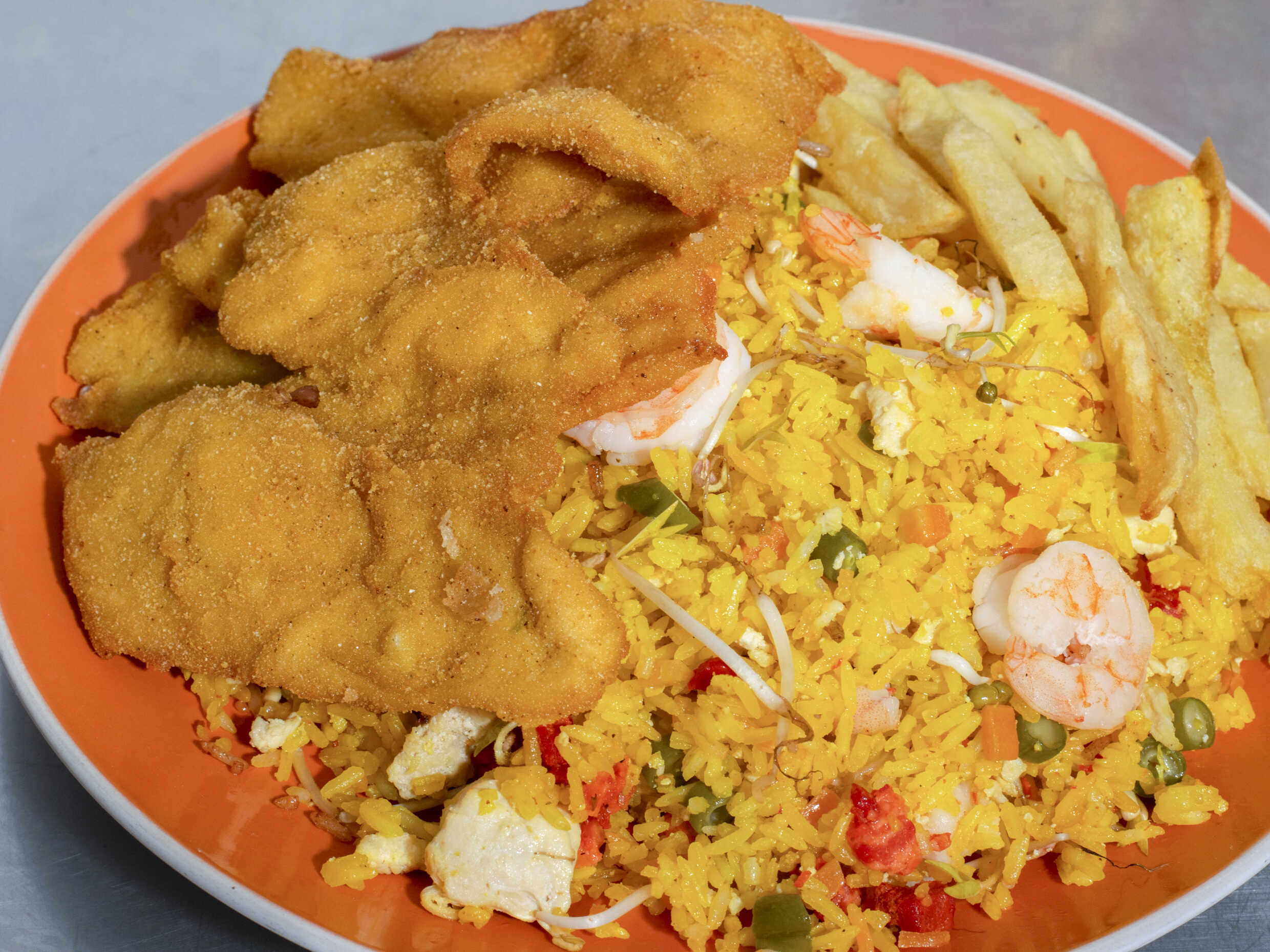 Arroz amarillo preparado con Pollo, cerdo, camarón, verduras y papas a la francesa. Acompañado con dos (2) porciones personales de chuleta de pollo.