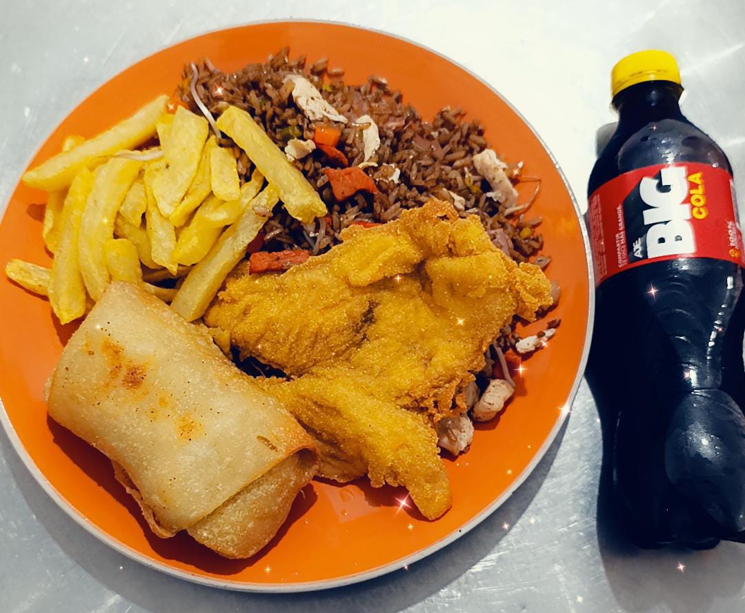 Arroz chino elaborado con Arroz, pollo, cerdo, jamón, zanahoria habichuelas, raíz china, dos presas de pollo, papas a la francesa y dos gaseosas personales