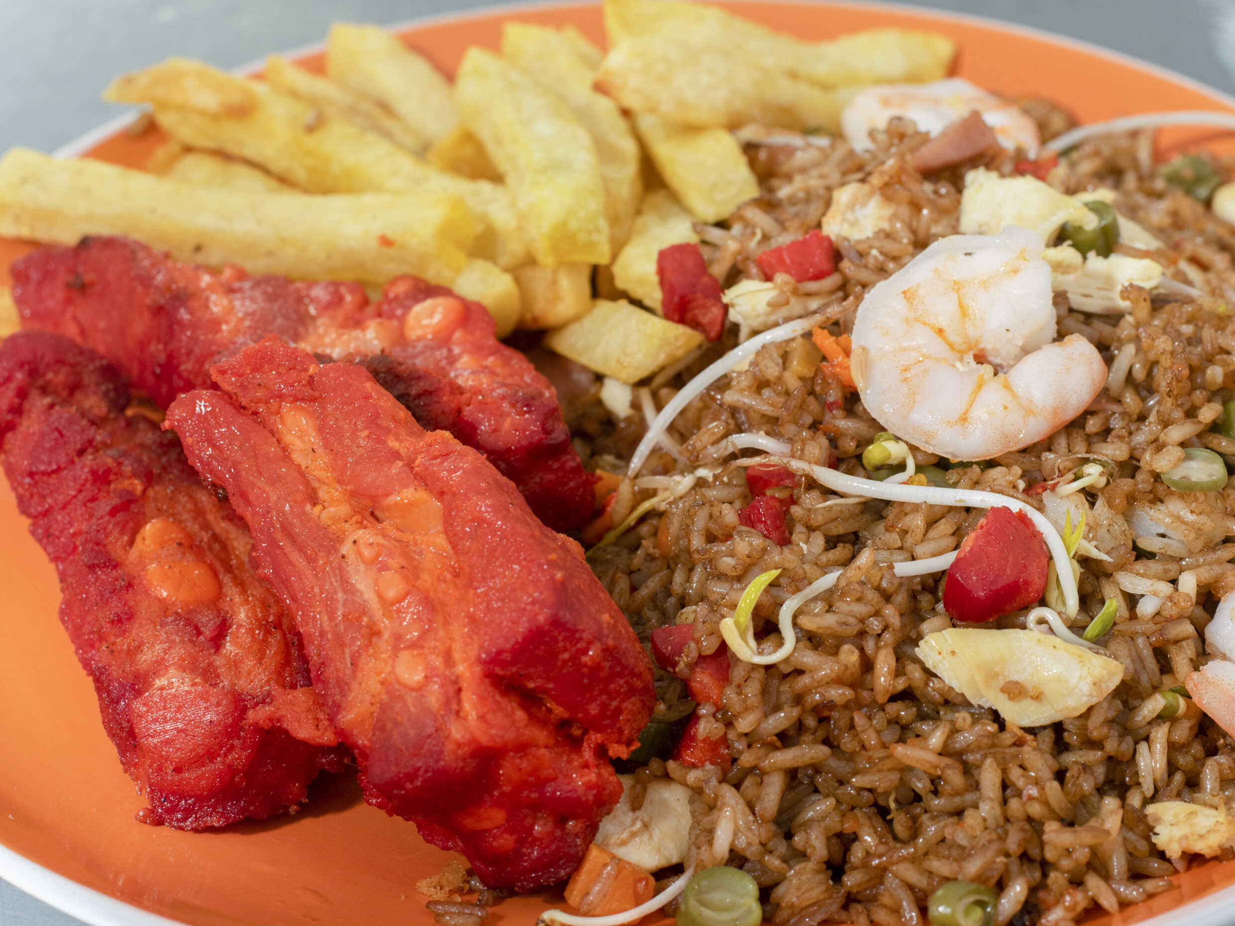 Arroz chino con costilla, papas francesas, pollo, cerdo, jamón, camarón, zanahoria, habichuela y raíz china.