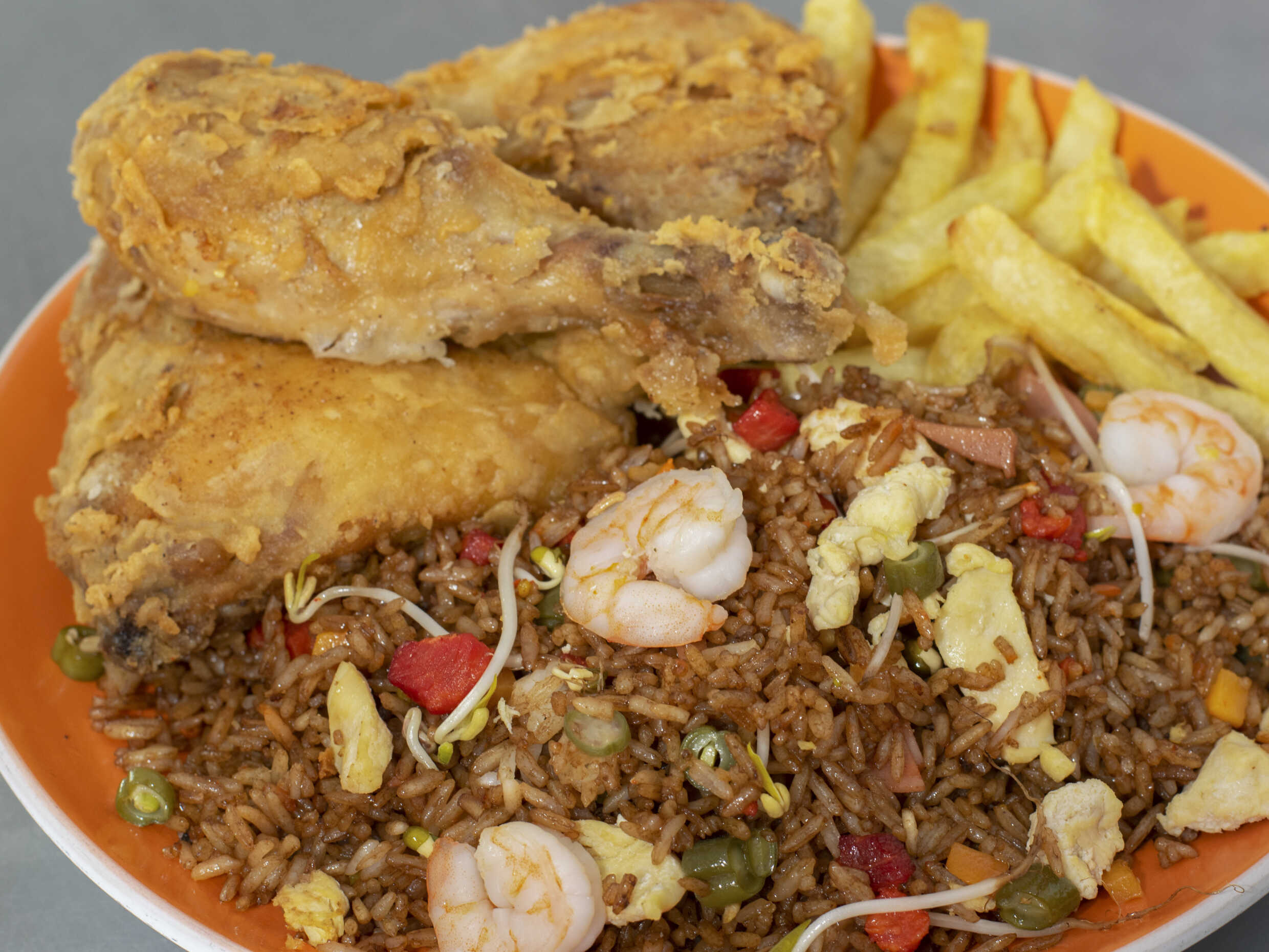 Arroz Chino preparado al wok con pollo, cerdo, jamón, camarón, zanahoria, habichuela y raíz china. Acompañado de Papas a la francesa y 1/2 pollo Apanado