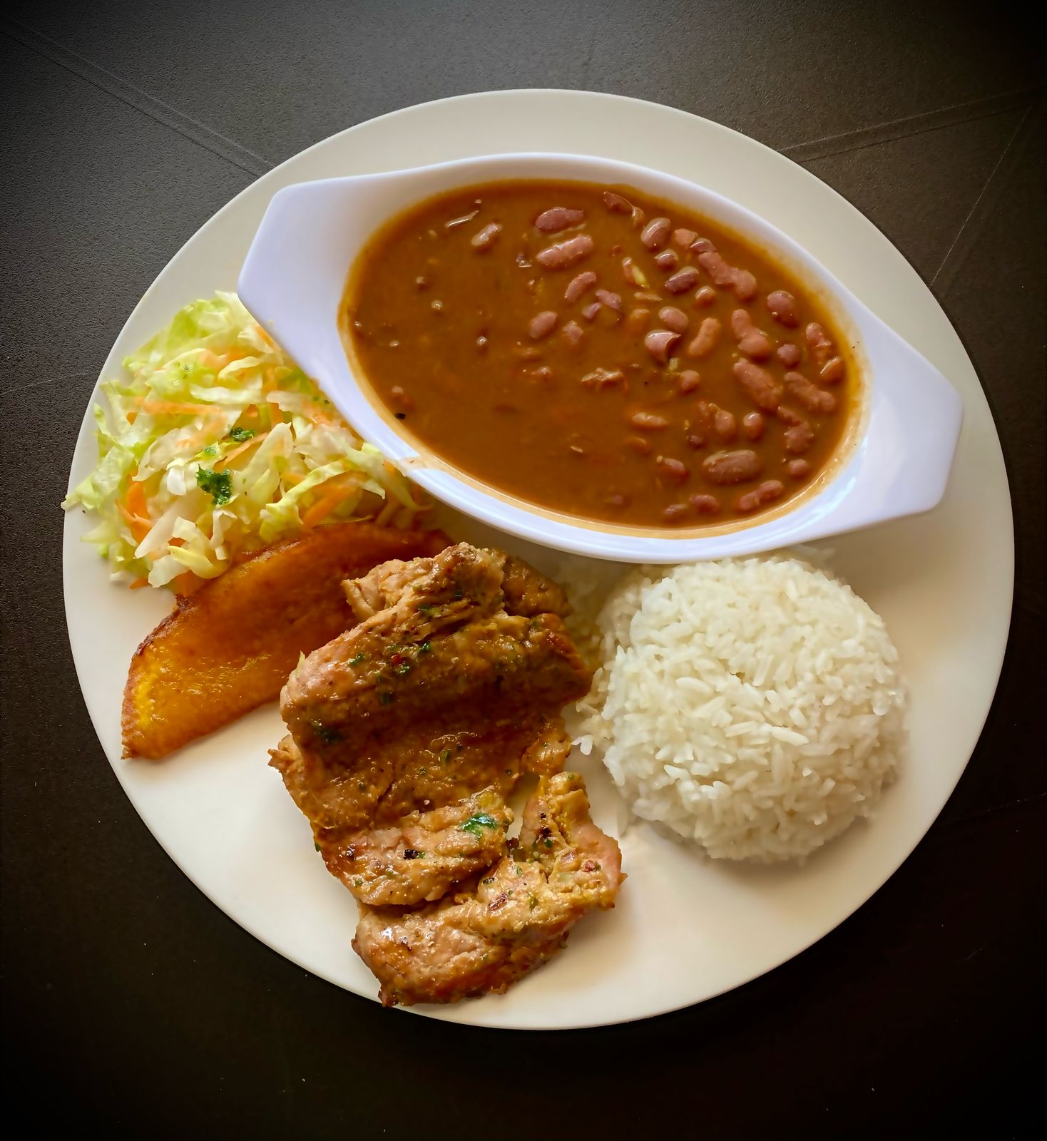 130 g De cerdo a la parrilla, acompañado de arroz, ensalada, maduro, principio, sopa y bebida.