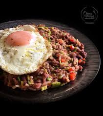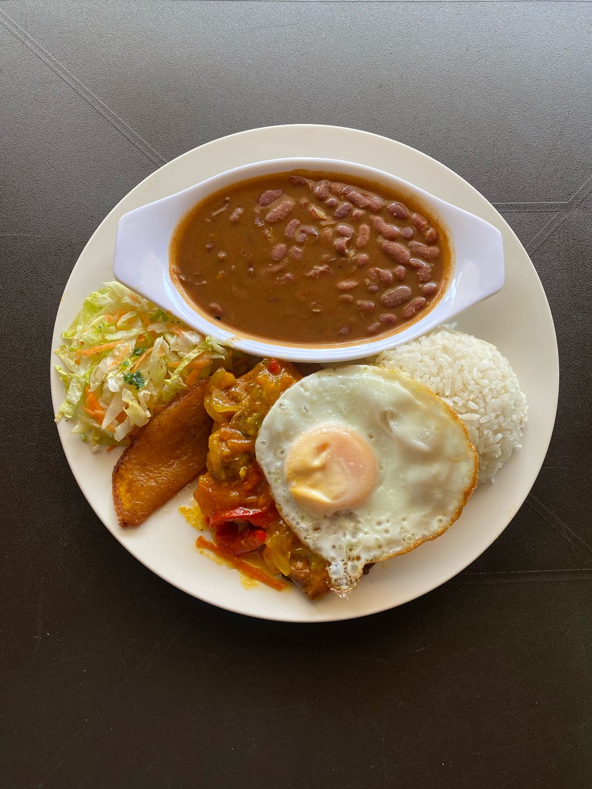 Arroz, carne molida, tocino crocante, huevo frito, chorizo 100% caserito, ensalada y arepitas.